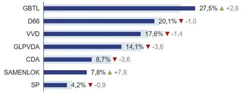 procent meer dan de vorige keer. D66 verliest iets, maar is met 20 procent van de stemmen de tweede