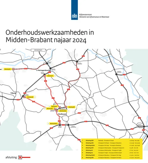 Vanaf september werkt Rijkswaterstaat aan verschillende snelwegen in Midden-Brabant. Het gaat om onderhouds- en asfalteringswerkzaamheden aan de A59, A58, N2/A2, en de A50 tussen Eindhoven, Tilburg, ’s-Hertogenbosch en knooppunt Paalgraven. In totaal zijn er 7 wegafsluitingen nodig om de werkzaamheden te voltooien. De werkzaamheden brengen hinder voor weggebruikers met zich mee.