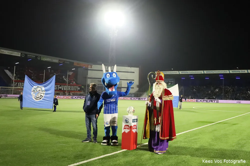 Sinterklaas en Bozzie zorgden voor de aftrap en de wedstrijd begon met een mogelijkheid voor Almere City FC. De Haan kon vrij op Van de Merbel af maar schoot recht op de keeper. Even later redde Van de Merbel opnieuw een poging, dit keer van Rijkhoff.